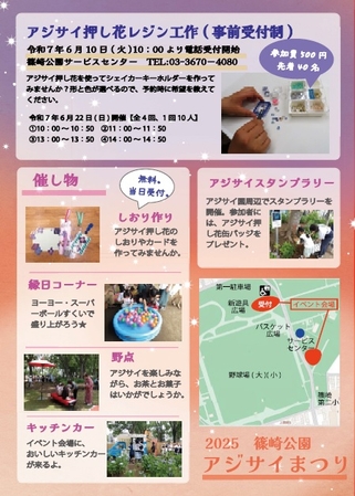 篠崎公園のビュースポットであるアジサイ園と令和7年4月にオープンした新遊具広場で、アジサイの見頃に合わせて、「アジサイまつり」を開催します。