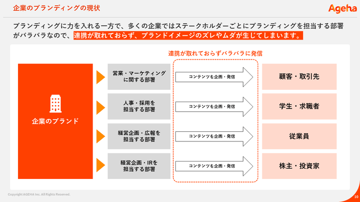 近年、大きく変革する外部環境において、BtoC企業・BtoB企業を問わず、自社のブランドを理解し提示することが求められています。しかし、ブランディングに力を入れる一方で、多くの企業ではステークホルダーごとにブランディングを担当する部署が異なり、連携が取れておらず、ブランドイメージのズレやムダが生じているという現状があります。