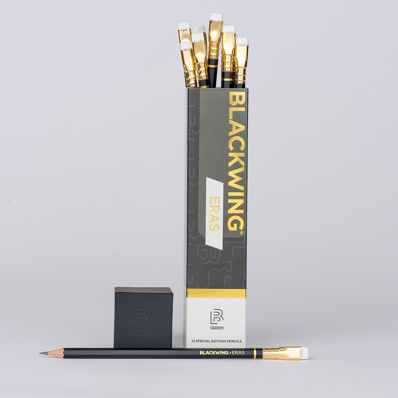 マットブラックの軸にゴールドバンド、ゴールドフェルール、ホワイト消しゴムを組み合わせ、ブランドを象徴するソフトグラファイトを採用。