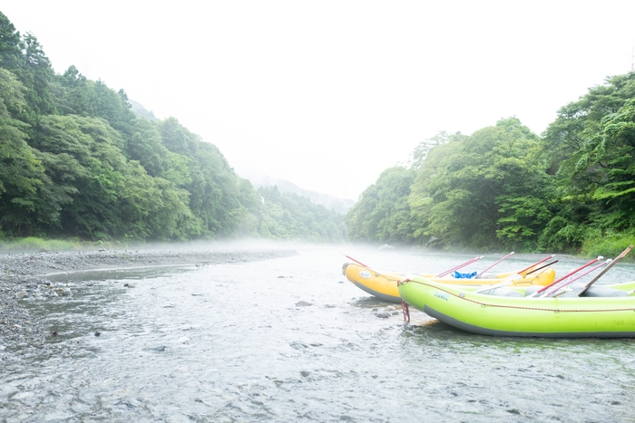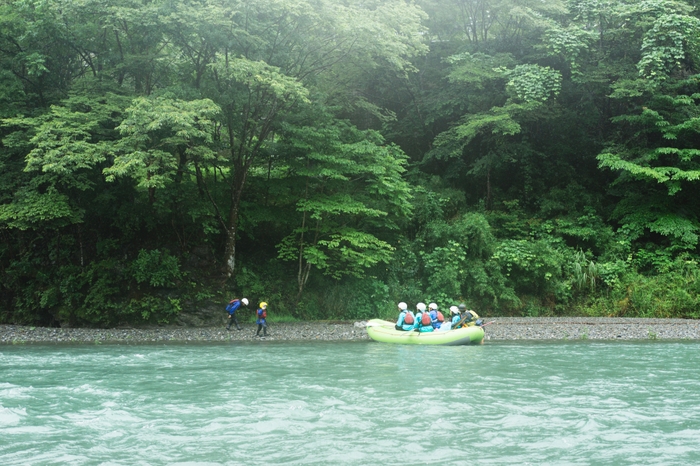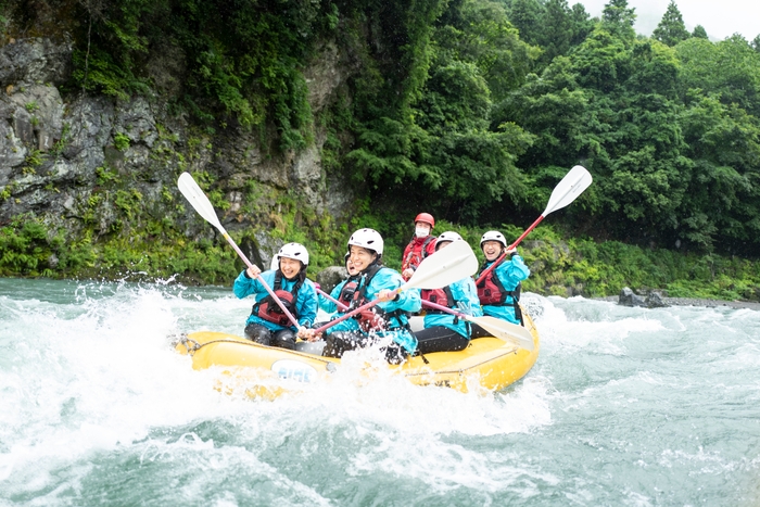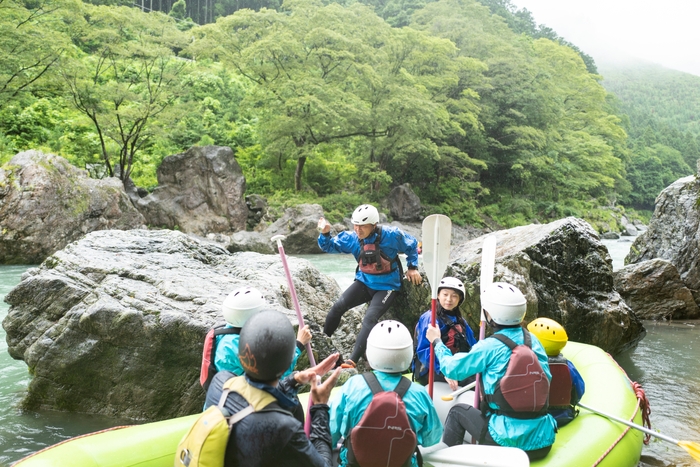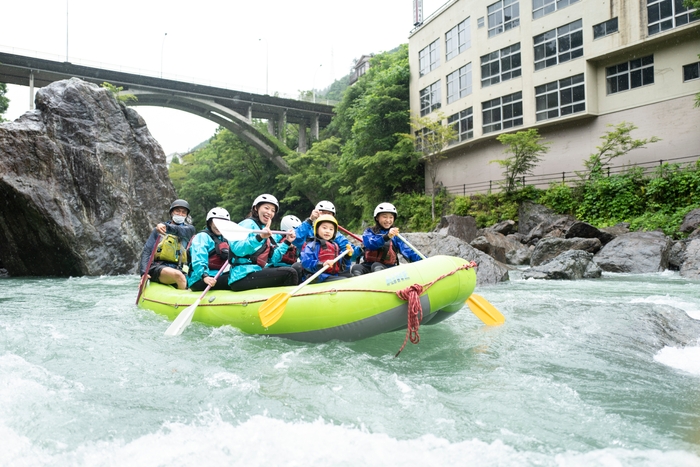 ラフティングボートを率いるのは、御岳渓谷でリバーアクティビティサービスを提供する「みたけレースラフティングクラブ」代表の柴田大吾さん。世界選手権2位の経歴を持つラフティングプランナーです。