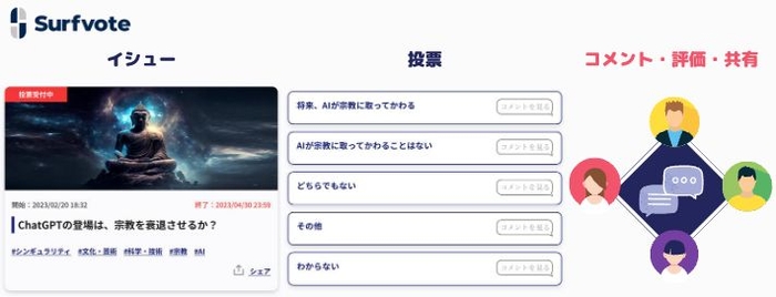 当社が提供するSNS「Surfvote」は社会にあるさまざまな課題を問題提起し、それについて誰もが簡単に意見を投票できるサービスです。Surfvoteでは「イシュー」と呼ばれる各テーマ(課題)に対して複数の選択肢から自分の意見を投票できます。また他のユーザーのコメントを見たり、評価(いいね)したりすることもできます。