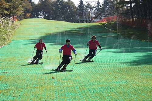 「サマーゲレンデ」は、地面に人工のカービングマットを敷き詰めたコース上を滑走します。スキー・ボードのエッジ部分がマットに噛みやすい構造になっているので、カービングターンのように鋭敏なターンの感覚が楽しめます。オフシーズンでも雪に近い感覚でスキー・ボードを楽しむことが出来るので、本格シーズンに向けての練習に最適です。