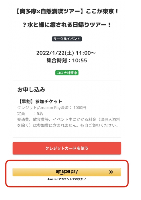 手順1 つなげーと上で、イベントの事前決済が求められている場合には「クレジットカード決済」および「Amazon Pay決済」のいずれかの決済方法から選んでいただけます。