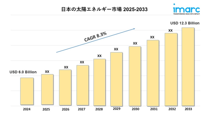 日本の太陽光発電市場規模は、2024年に60億米ドルと評価されました。今後、IMARCグループは、市場規模が2033年までに123億米ドルに達し、2025年から2033年にかけて8.3%のCAGRで成長すると予測しています。