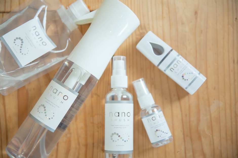 可視光応答光触媒スプレー『nanoSHUSH ナノシュッシュ』は、2ナノサイズの酸化チタンを使った光触媒がベースになったコーティング剤で、抗ウイルス・抗菌・防汚・消臭が可能です。