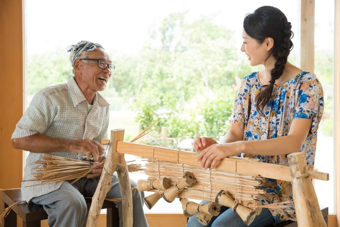 島の方々は昔、農業や生活のための民具を島に自生する植物から作っていました。また、米作りのため、伝統的な木造帆船「サバニ」に乗って近隣の島まで往復していた時代もあります。このように歴史・文化と深く結びつく民具やサバニを、竹富島の魅力として未来に残していきたいという思いから、当施設では民具づくりやサバニ操船のアクティビティを提供しています。いずれも島の方々と交流ができる体験です。開業当初から島の方々と話し合い、温かい協力をいただき、これまで体験を実施してきました。また、ダイニングやラウンジ、客室で民具を取り入れたり、1日1組限定の特別なサバニ操船アクティビティを企画したりと、今後も島の方々にご協力いただきながら伝統文化の魅力をお客様に伝えられるよう取り組みます。