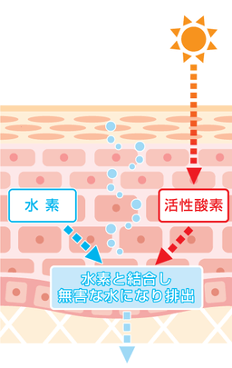 日差しを浴びて発生した活性酸素以外にも、体内で発生した活性酸素と素早く結びつき、無害な水にして体外に排出する鶴見式水素。