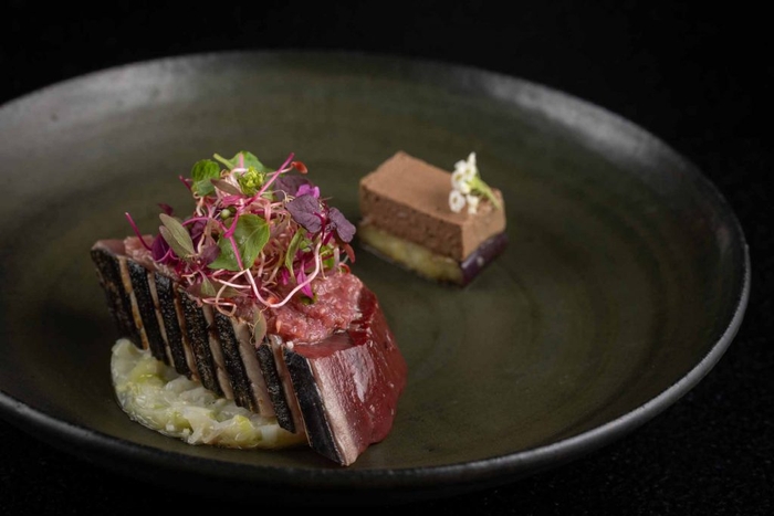 夏に旬を迎える鰹を使った前菜です。藁焼きにし、米麹醤とごま油でマリネした鰹に、南高梅やみょうがといった夏らしい食材と酒盗をあわせたソースをのせています。藁焼きにすることで、旨味が閉じ込められた鰹には、爽やかな酸味のソースがよく合います。また、鮮度が落ちるのが早いため、普段は捨てられてしまう鰹の血合いを使った、鰹のブーダンノワール(フランス料理で、豚肉の血と脂で作られる腸詰めの一種)も添えています。野菜と一緒に火を通した鰹の血合いを、ハーブとあわせ、オーブンで蒸し焼きにしています。付け合わせの、鰹出汁に浸した焼きなすが、鰹のブーダンノワールの濃厚な味わいを際立たせます。