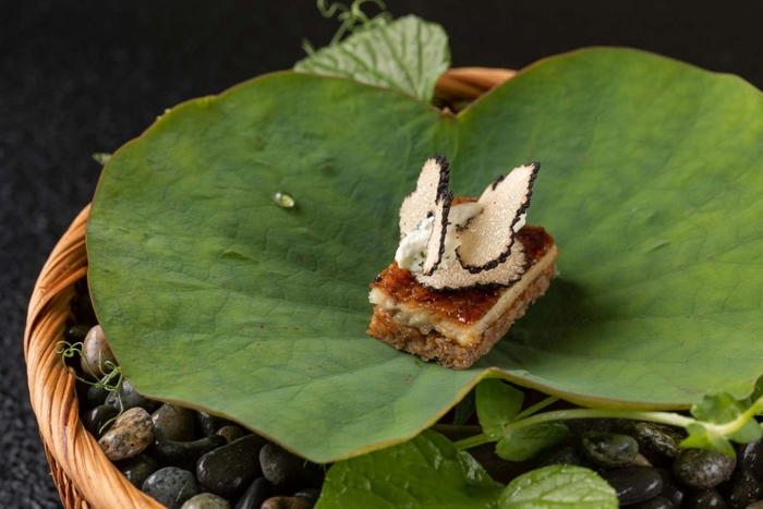 約6時間コンフィ(食材を油に浸し、じっくりと煮るフランス料理の調理技法)した鮎を、パートブリック(小麦粉で作られた薄い皮)で包み、焼き上げた独創的な一皿です。頭や骨まで味わえるほど柔らかな鮎の身と、パリパリとしたパートブリックの食感のコントラストが特徴です。鮎の内臓を発酵させて作る発酵調味料「黒うるか」と、黒オリーブやにんにく、ケッパーなどをあわて作った、程よい苦味と酸味のあるタプナードソースを付けながら味わいます。付け合わせとして、スイカのピューレやグリーントマト、ビネガーを使った爽やかな風味のスイカのカッペリーニを提供します。