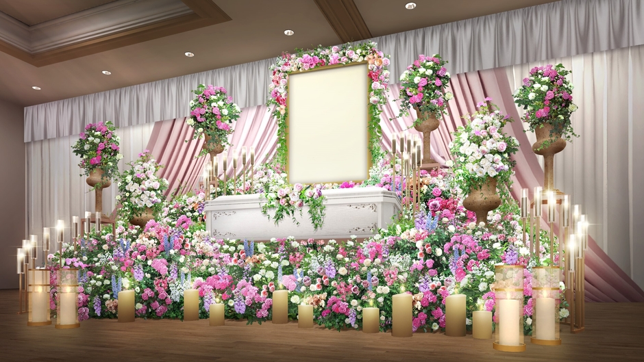 1,000万円プラン、800万円プラン、600万円プラン、500万円プラン、300万円プラン、230万円プラン(※表記価格は税別)のそれぞれにデザインを2パターンご用意しており、全12プランからお好みやご予算に合わせて柔軟にお選びいただけます。全てのプラン名には花の名前を使用しており、花の香りや花がつくりだす優しさや繊細さが強調された空間美を感じられる、花の特徴を存分に生かした、花いっぱいの空間で故人を温かく送っていただける内容となっています。中でも、1,000万円プランの『Rose Yves Piaget イヴピアッツェ(バラ)』は、最高級品質の気品と甘く濃厚な香りを感じられる「イヴピアッツェ」を含めたバラを約1,000本使用し、宮殿のように花々が咲き誇る空間をつくりあげます。