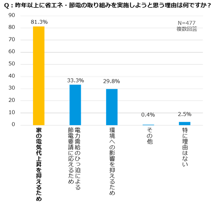 省エネ・節電に積極的に取り組む理由を聞いたところ、約8割(81.3%)の人が「家の電気代上昇を抑えるため」と回答し、他の項目を大きく抑えて最も多い結果となりました。節電要請に応えたい気持ちや、近年高まりつつある環境への意識がありつつも、現状では日常の生活と密接にかかわる「電気代の上昇」を強く意識している人が多いようです。