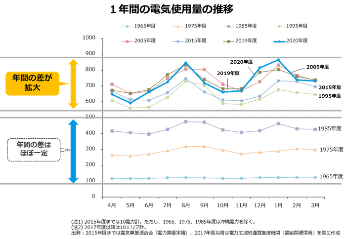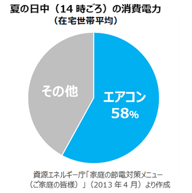 資源エネルギー庁の調査によると、夏の日中(14時ごろ)の一般家庭における電力消費は、照明や冷蔵庫を抑え、エアコンが最大(58%)で約6割を占めていると言われています。さらに、以前は、電気使用量は年間を通じてほぼ一定だったのが、近年、季節によってその差が拡大しています。夏と冬に電気使用量のピークを迎えていることから、季節によって使用頻度が大きく変わるエアコンも、夏場の電力需給に与える影響は大きいと考えられます。