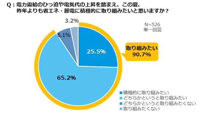 「この夏、昨年よりも省エネ・節電に取り組みたい」と回答した人は約9割(90.7%)と、大多数の人が省エネ・節電に積極的であることがわかりました。電力需給のひっ迫や、電気代の値上がりを背景に、この夏に向け、省エネ・節電に対する人々の意識は大きく高まっているようです。