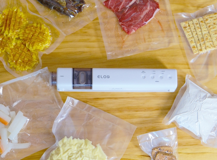 片面にエンボス加工のある袋に食品を入れて、本体に設置し、ボタンを押すだけで「吸引からシーリング」する事で真空パックにすることができます。