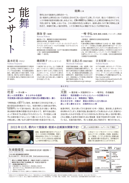 一般財団法人 伝統文化創造推進機構主催、『能舞コンサート』が2022年12月3日(土)に矢来能楽堂(東京都新宿区矢来町60)にて上演されます。