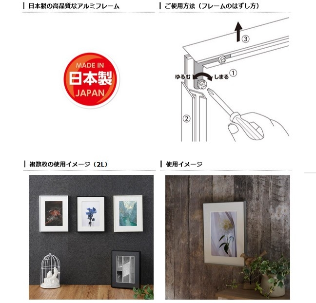 奥行き感のあるフレームは高品質な日本製。コーナー金具のネジをゆるめて短辺から出し入れができる、位置決めのしやすい差し込み式フレームです。