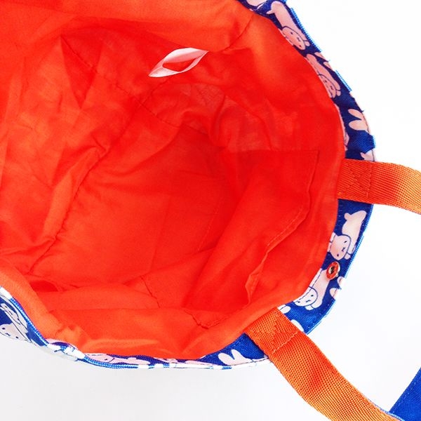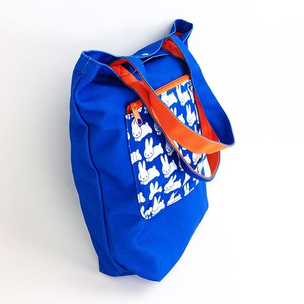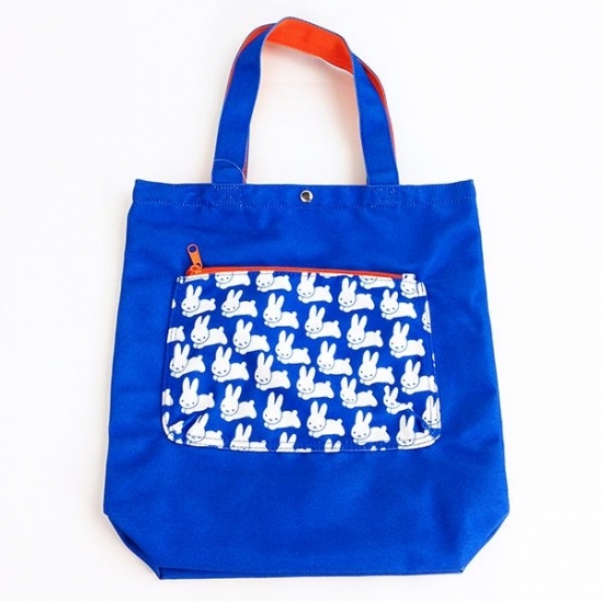 こちらは少し大きめのトートーバッグです。縦長のスクエアが使いやすそうですね。ブルー地に、真ん中にミッフィーデザインのポケットがついたデザインで、さりげなくファスナーがオレンジ色なのもポイントです♡