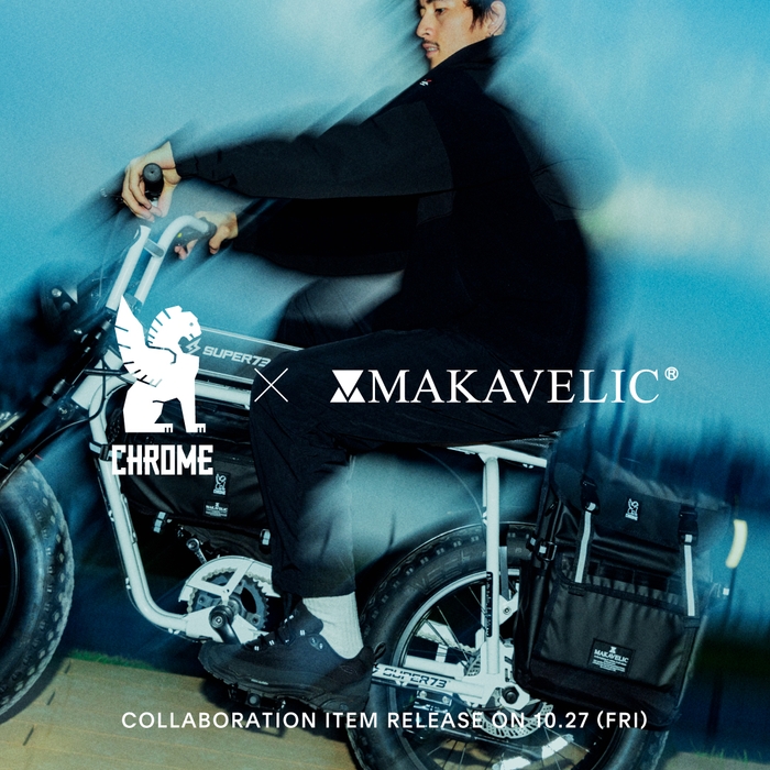 自転車生活を、より楽しく快適にするギアを生み出し続ける CHROMEと、SUPER73をはじめとするe-Bike専門店 MAD BOLT GARAGEを展開しているREGALITH社のオリジナルバッグブランド MAKAVELIC。バッグと自転車と言う共通項を持つライバル同士がお互いをリスペクトし、常にライバルとして切磋琢磨して高め合う中、今年10周年を迎えるMAKAVELICを祝福すべく協業し、より多くの人々に自転車を楽しんでもらえるようなバッグをとの想いからこのサプライズコラボが実現。今回はスペシャルコラボ仕様に仕上げた2スタイルを発表。最も人気の高いスリング”KADET”をベースにした『e-KADET』と驚きの5通りの使い方が可能な『HOLMAN PANNIER BAG』は、2023年10月27日(金)両ブランド公式オンラインストアやCHROME STOREなどの一部店舗にて限定販売開始。
