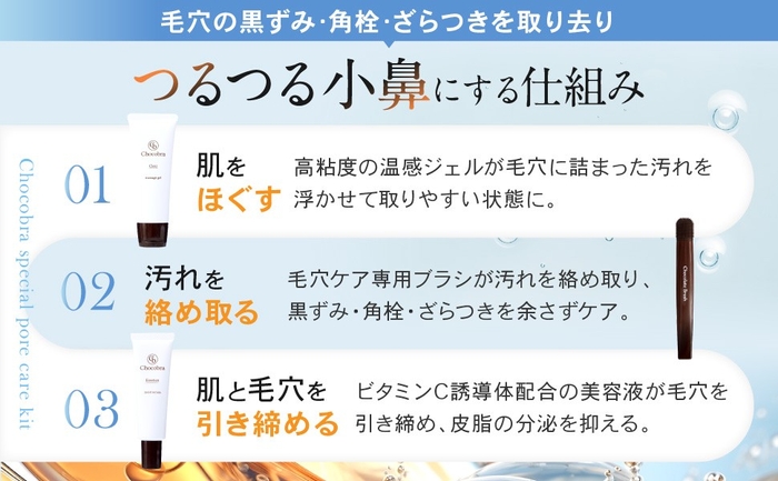 ザ・プレミエールファクトリー株式会社が展開する毛穴ケアブランド「Chocobra」は、構造的なアプローチによる毛穴対策を提唱し、従来の即効性重視の製品とは一線を画す存在です。今回新たに公開された「スペシャル毛穴ケアセット」のLPでは、製品の特長である「角栓詰まりを防ぐ予防的ケア」や「日本製シリコンブラシの技術力」といった情報を、視覚的に分かりやすく整理しながら伝える構成を採用。洗練されたデザインと分かりやすい情報設計によって、製品価値の正確な理解を促す内容となっています。