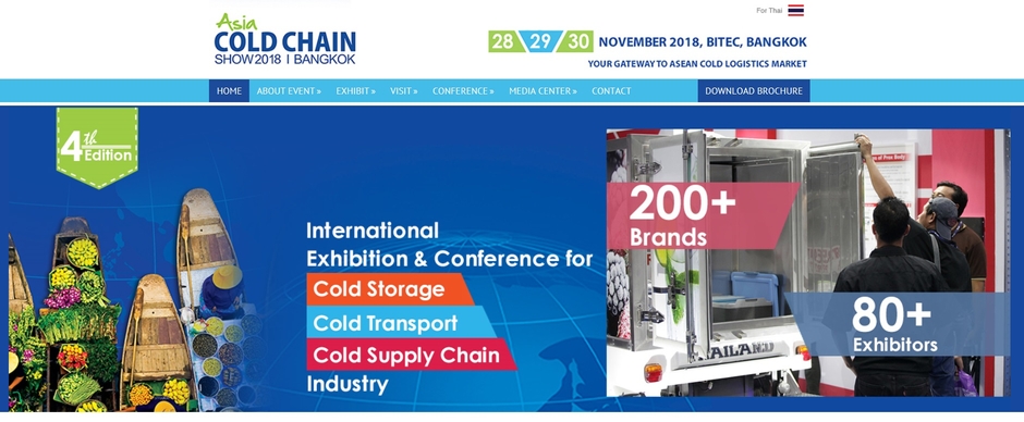 第4回Asia Cold Chain Showは2018年11月28日、29日、30日の3日間、タイ・バンコクのBITEC (バンコク国際貿易展示場) にて開催されます。同展示会は、ASEANのコールドチェーンビジネスが示す成長の機会を捉え、コールドチェーンおよび物流部門の専門企業へエンドユーザー産業との協力に向けた十分な機会を提供します。展示会の期間中、コールドストレージおよびHVAC産業が提供する設備、機械、技術およびソリューションが展示されます。
