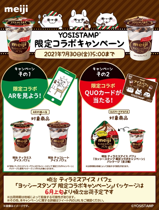 また、本コラボを記念して発売される「明治 ティラミスアイス パフェ」の「ヨッシースタンプ 限定コラボキャンペーン」パッケージを購入すると、「ヨッシースタンプ 限定コラボQUOカード」が合計500名様に当たるプレゼントキャンペーンも実施いたします。