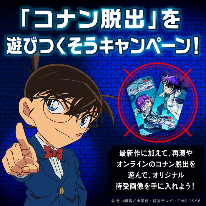 さらに、今回の再演決定を記念して『「コナン脱出」を遊びつくそうキャンペーン』も実施いたします。最新作『黒鉄の海中研究所からの脱出』に加えて、もう1つ「コナン脱出」シリーズを遊んだ方には「オリジナル待受画像」をプレゼント! 今回再演が決定した4作品はもちろん、コナンたちとともに3つの事件に挑む『チョコレート殺人事件』や、自宅からオンラインで友達とつながり楽しめる『四重捜査網からの脱出』も対象です。
