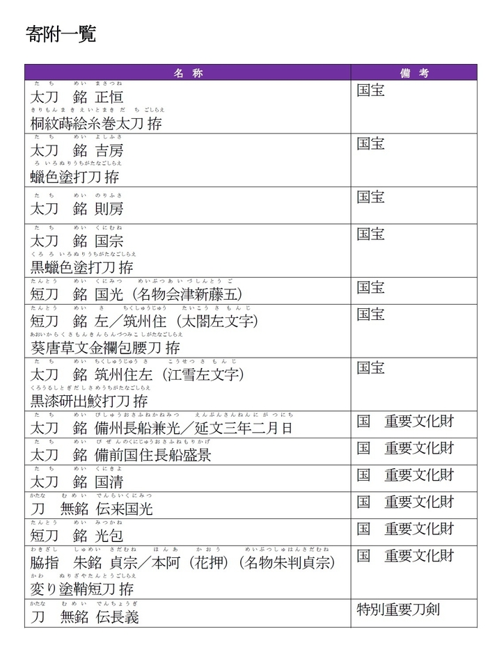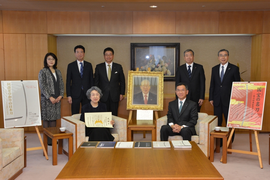 福山市(広島県)は、1月16日に福山市名誉市民・故小松安弘さんが収集した刀剣コレクションの寄附受納式を行いました。ふくやま美術館で永続的に活用して欲しいという思いから、2010年度以降ふくやま美術館で登録美術品として積極的に展示公開をしてきた国宝7点・国重要文化財6点および、2017年度に追加で寄託された福山藩主阿部家伝来の1点(特別重要刀剣)の刀剣全14点からなる「小松安弘コレクション」を、小松啓子さんより寄附がありました。この寄附により、ふくやま美術館は一つの文化施設がもつ国宝の刀剣の数として国内で2番目に多い施設となりました。
