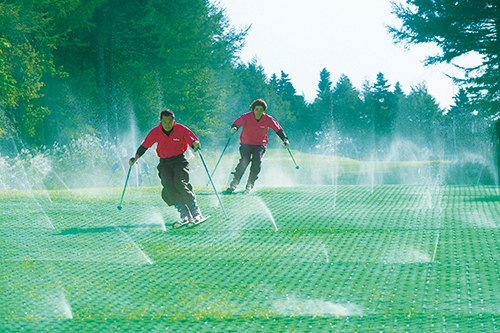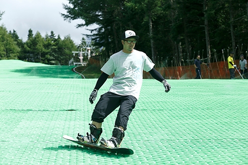「サマーゲレンデ」は、滑走性に優れた人工マット「カービングマット」を地面に敷き詰めたコース上を滑走し、夏でも雪上に近い感覚でスキー・スノーボードを楽しむことができます。冬のスキー板・スノーボード板・ブーツをそのまま使用し滑走できるので、冬に向けてのスキルアップにも最適です。カービングマットはスキー・スノーボードの板のエッジ部分がマットに噛みやすい構造になっている為、カービングターンの様な鋭敏なターンの感覚が得られます。