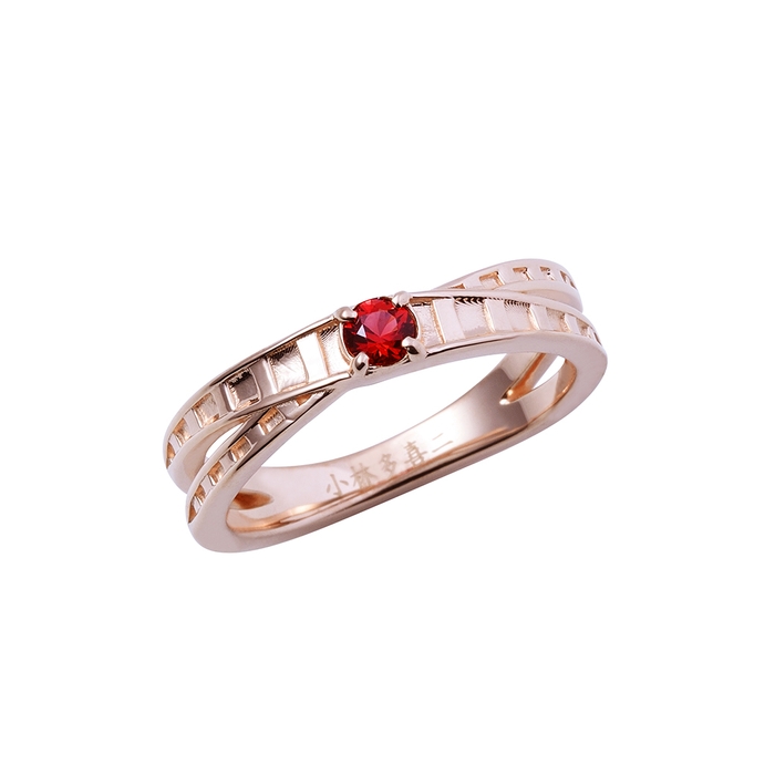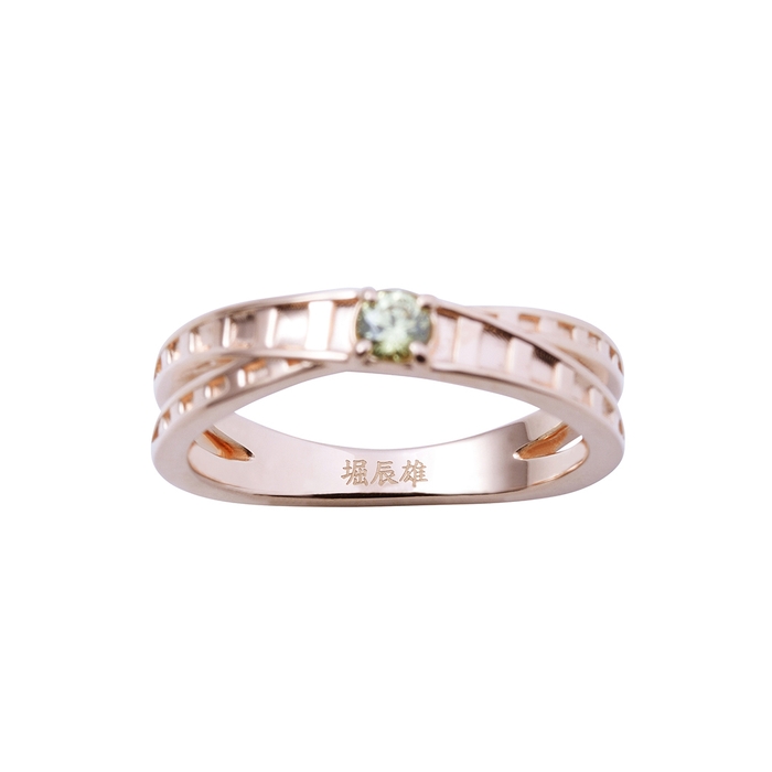 ピンクゴールドコーティングを施した表面にはイメージカラーストーン、内側には名前を刻印しました。