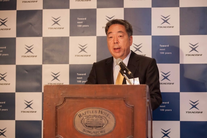 on March 3,2015,TSUNEISHI SHIPBUILDING Co., Ltd. hosted the “TSUNEISHI Day 2015” event for the purpose of deepening relationships with customers. This was held at Raffles Hotel in Singapore with 130 Asian customers in attendance and was the second installation of the same event held in London on February 11. In attendance from the host’s side were Mr. Kenji Kawano, who was appointed President in January this year and, Mr. Hitoshi Kono, the new Director and Ship Sales Division Manager as well as Mr. Yasuharu Fushimi, Chairman & President of Tsuneishi Holdings Corporation and Mr. Akihiko Mishima, President of Tsuneishi Heavy Industries (Cebu), Inc. (THI) and Mr. Hirotatsu Kambara, President of KAMBARA KISEN Co., Ltd.