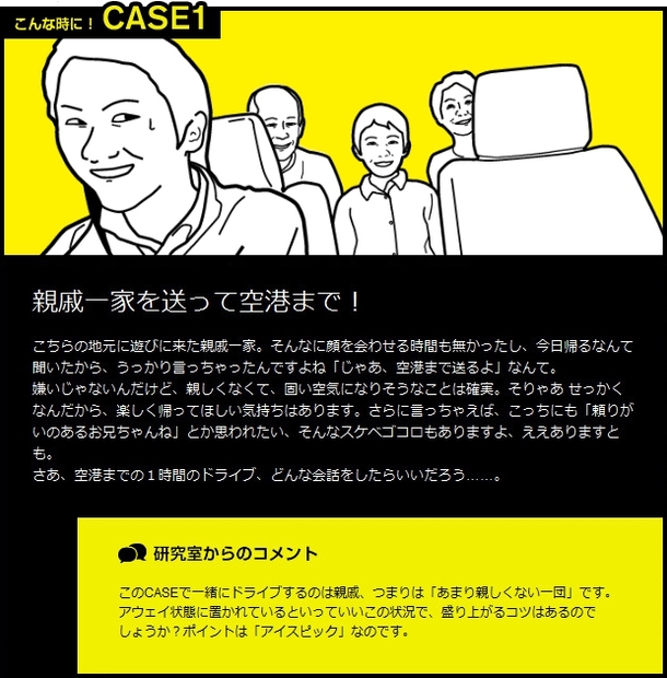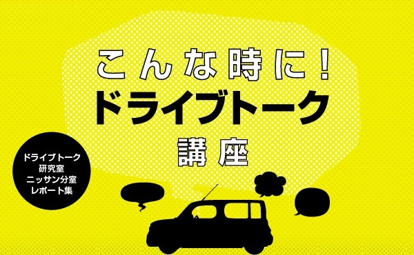 ドライブの楽しさとは何か…?それは、同じ空間を共有した人たち同士の上質なコミュニケーションです。つまり、ドライブの楽しさの真髄はドライブトークの楽しさなのです。このことに気付いた「ドライブトーク研究室」は、研究の成果として『こんな時に!ドライブトーク講座』(http://drive.nissan.co.jp/DRIVETALK/)をスタートしました。