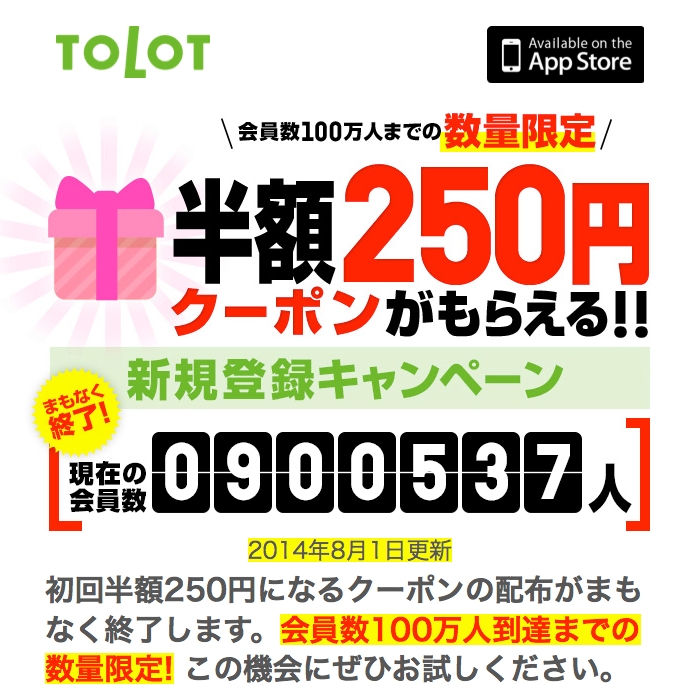 お友達紹介キャンペーンにつきましては、100万人達成後も継続いたしますが、割引クーポン額を現在の250円から減額する予定です。こちらも今が大変お得になっておりますので、まだTOLOTを使ったことがないお友達にお客様の紹介コードをどんどん広めて共有してください。