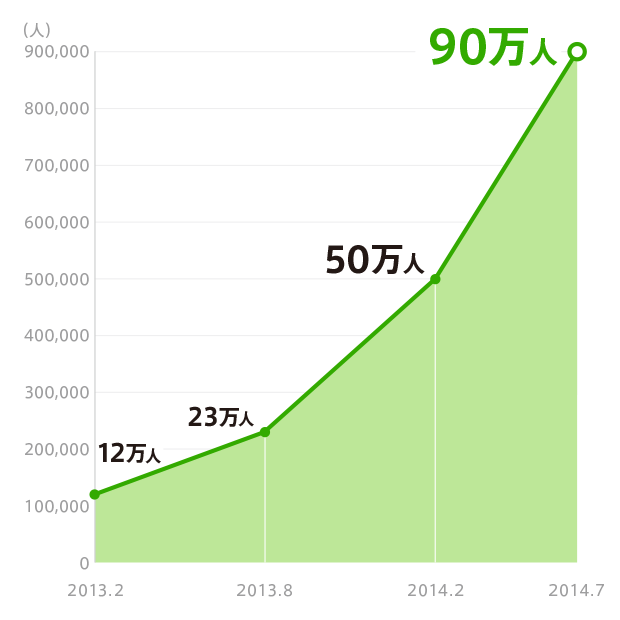 2014年2月に会員数50万人、5月に70万人、その後2ヶ月あまりで90万人を突破と、当初の予定よりも速いスピードで会員数が増加しています。メインユーザーの20代、30代の主婦層だけでなく、SNSやブログなどでのクチコミが牽引して、若いカップルや学生など10代、20代の利用率が上がっている点が要因と推測されます。