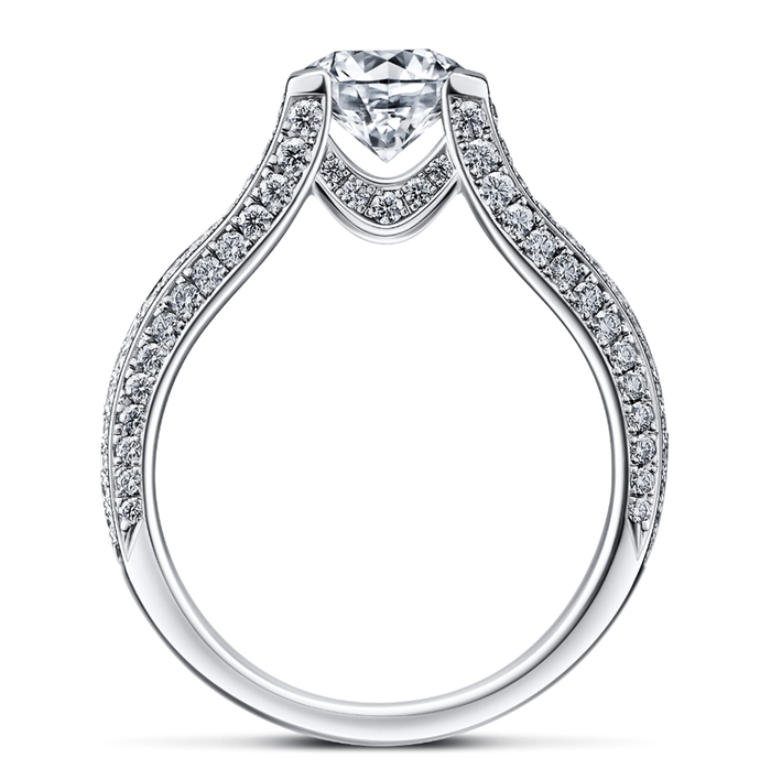 1番こだわった点は、メレダイヤモンドの彫留めです。全126ピースものメレダイヤモンドがより際立つように、メレ同士が重ならないギリギリの間隔を見極める為に何度も試作を重ね、アームの際まで敷き詰めることに成功しました。仕上げにはマイクロスコープを用い、昔ながらの手作業による磨き上げで、納得のいく逸品をおくり出しました。