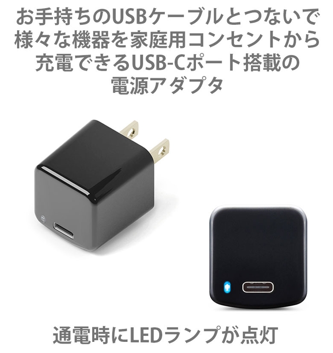 お手持ちのUSBケーブルとつないで様々な機器を家庭用コンセントから充電できるUSB-Cポート搭載の電源アダプタです。軽量26gのコンパクト設計でプラグも収納できる為、持ち運びに便利なデザイン。1.5A出力で通電時にLEDランプが点灯します。また海外対応※100V~240Vなので旅行先でも使用できます。※別途変換プラグが必要となる場合があります。海外での使用は保証対象外となります。