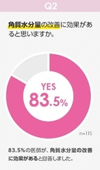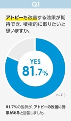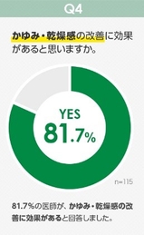 また、この臨床実験の結果をもって医師115名を対象にアンケート調査を行ったところ、81.7%が「アトピーへの有用性が期待でき、積極的に摂りたい水だ」と回答したほか、角質水分量の改善、かゆみや乾燥感の改善にも8割以上が「効果を期待できる」と回答。「日田天領水」に対する期待の高さを感じられる結果となりました。
