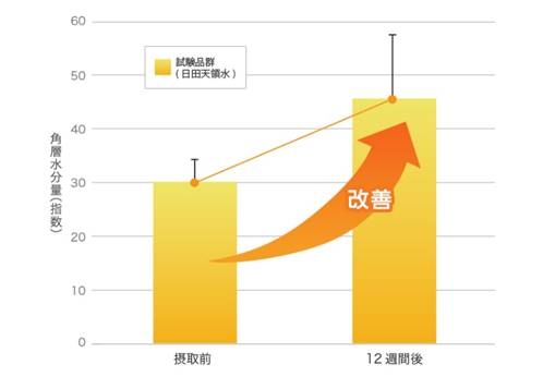 肌の角質に含まれる水分量は、肌の乾燥具合に影響する指標です。日田天領水を摂取した試験品群の被検者では、一般のミネラルウォーターを摂取したプラセボ群の被検者と比較して、角層水分量評価で明らかな水分量の上昇が見られ、肌の乾燥を抑止する肌の保湿効果が確認されました。