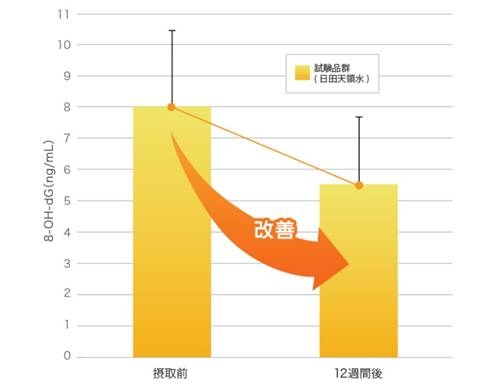 皮膚炎症状を悪化させる要因となる肌の酸化ストレスを定量的に評価する指標「8-OH-dG(DNA酸化損傷マーカー)」について、日田天領水を摂取した試験品群の被検者と一般のミネラルウォーターを摂取したプラセボ群の被検者を比較したところ、試験品群の被検者について「8-OH-dG」の値が減少する改善効果が確認されました。この「8-OH-dG」の値が低いほど、肌に対する酸化ストレスが少ないことを示しています。