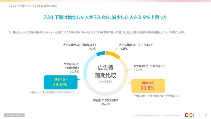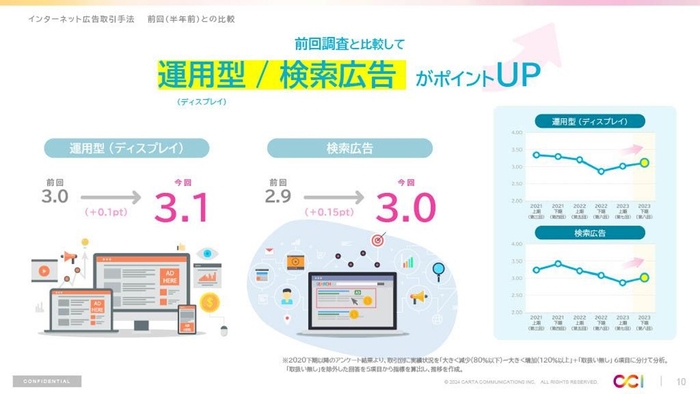 株式会社CARTA HOLDINGSのグループ会社である株式会社CARTA COMMUNICATIONS(東京都港区、代表取締役社長:目黒 拓、以下「CCI」)は、2023年12月、国内のデジタルマーケティング業界の関係者を対象に、2023年下期インターネット広告市場動向および、これからの広告指標についての調査を実施しました。