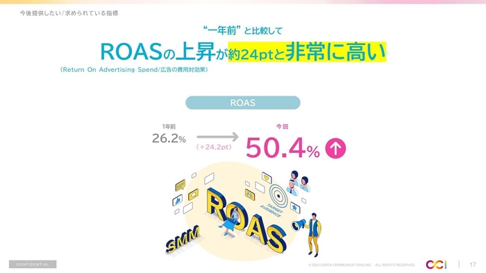 マーケティングやキャンペーンの成果・効果・分析・レポートで提供したい指標について、2022年上期から3期に渡りブランドリフトが上位に入っていたが、2023年下期はROASのポイントが非常に高い結果となった。