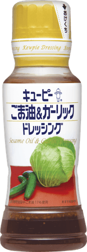 「ごま油&ガーリックドレッシング」は、ごま油の香ばしい香りに、炒めたにんにくのうま味を合わせたコク深い味わいのドレッシングです。キャベツやきゅうりなど単品野菜のシンプルなサラダから、主菜や主食になるボリューム感のあるサラダまで、幅広いメニューによく合います。