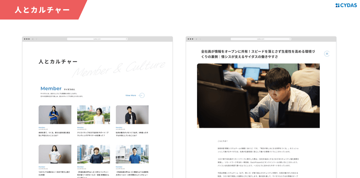 サイダスには、採用区分、これまでの経験、職種・年齢問わず、多様な人材が、それぞれの個性を活かし合いながら働いています。すでにサイダスブログサイトに掲載されている記事に加え、本リニューアルのために新規作成した記事も掲載。人とカルチャーの両面から、サイダスをより深く知っていただける構成となっています。
