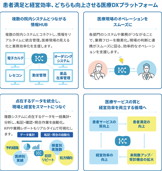【KarteConnect】は、電子カルテ・レセコンなどのデータ活用やシステム連携によるオペレーションの効率化、患者とのコミュニケーション機会の創出などを支援し、現場におけるリソースの最適化や患者満足度の向上を実現します。