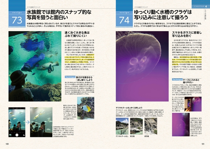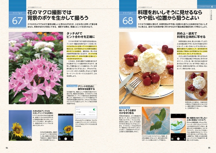 「映える写真」を撮るために知っておきたいカメラ、レンズ、撮影機材の機能とその活用方法、様々なシチュエーションにおいて活用したい撮影テクニック、スマートホンの機能や特性を活かして撮れる写真、さらに撮った後の画像を仕上げるためのアプリの紹介と使い方などを、100の撮影レシピとして掲載しています。