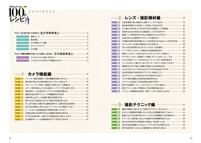 カメラ機能編では、シャッター速度やホワイトバランス、色味の仕上がり設定などの調整で撮ることが出来る14の撮影レシピを紹介。レンズ・撮影機能編では、広角/望遠/超望遠/マクロなどそれぞれのレンズならではの撮影レシピと、PLフィルター/NDフィルター/フラッシュなどを使用する23の撮影レシピを紹介しています。