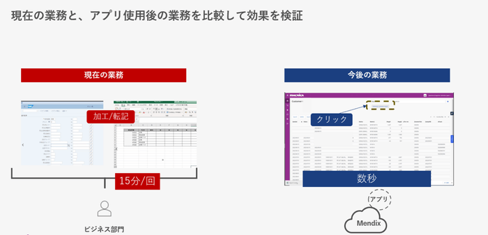 マクニカのメインビジネスである半導体事業において、一部の顧客への納期回答は、顧客事情にあわせてクイックかつ正確に行うために、ERPから出力されたデータとExcelを活用し、営業担当者が15分/回かけて作成していた実態がありました。そこで、業務改善するためのアプリケーション開発を企画。オレンジリーフのサポートのもと、ローコードでアプリを開発しました。その結果、業務分析からアプリ開発、業務改善効果を体験するまでにかかった作業時間は、トータルで14時間。このアプリのおかげで、毎回15分かかっていた作業時間が数秒で済むようになり、驚くほどの作業効率化を達成しました。この体験をきっかけに、以後、業務部門におけるさらなるDX業務変革テーマが続々と提案されるようになりました。