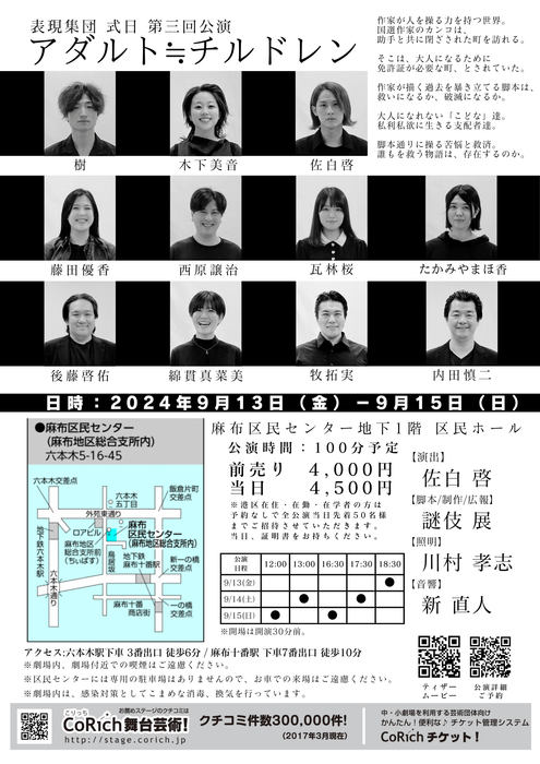 表現集団式日(代表:佐白啓)主催、『アダルト≒チルドレン』が2024年9月13日 (金) ~2024年9月15日 (日)に麻布区民センター 区民ホールにて上演されます。チケットはカンフェティ(運営:ロングランプランニング株式会社、東京都新宿区、代表取締役:榑松 大剛)にて発売中です。