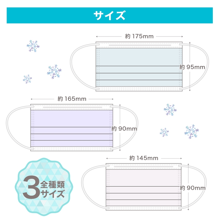 従来品同様ノーズワイヤー入りでマスクがフェイスラインにしっかりとフィット。⽴体プリーツ加⼯で⼝の周りに空洞ができるので息苦しさを軽減します。また、自分好みのフィット感を選べる3 サイズ展開な所も特長です。
