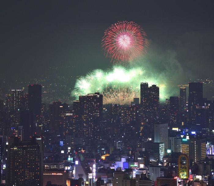 「ハルカス300(展望台)」から見る「なにわ淀川花火大会」(過去開催時の様子)