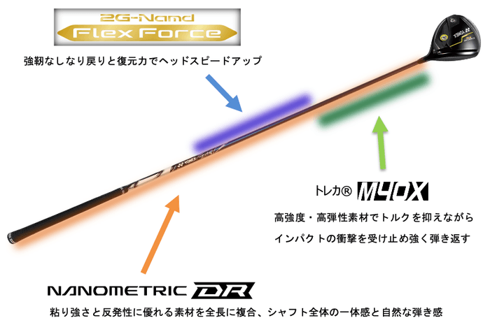 新次元カーボン「2G-Namd Flex Force」を中間部に搭載することで、しなりと復元力が飛躍的に向上。また高強度・高反発のカーボン素材「ナノメトリックDR」をシャフト全長に、強度と弾性を併せ持つカーボン繊維「M40X※」をシャフト先端に配置。これらの3種類のハイスペック素材を複合させた新設計により、軽さとブレにくさを両立しつつ、高初速・高弾道で飛距離をアップさせます。
